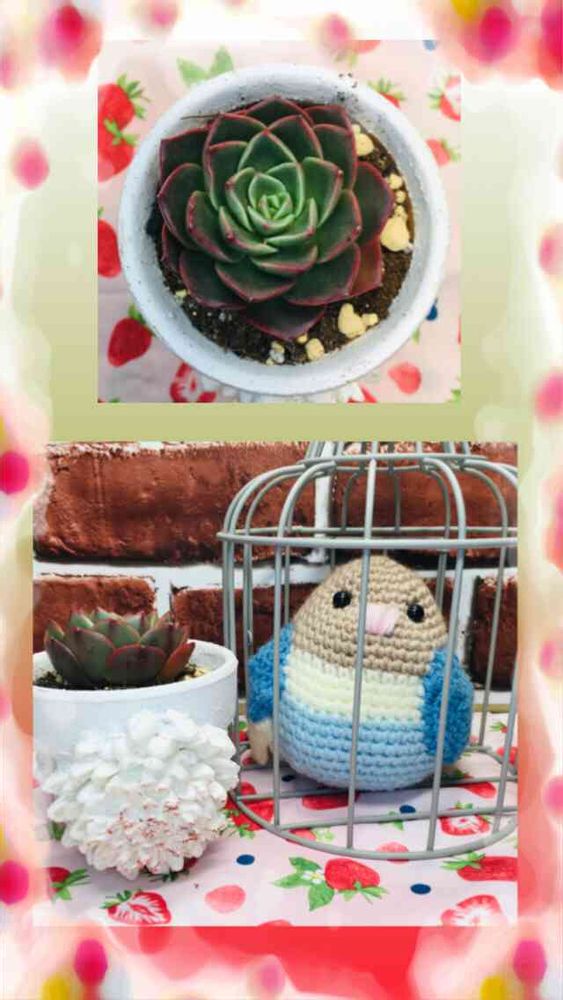 多肉ちゃんを鳥かごに入れることも考えましたが、ほーちゃんさんの素敵なリメ鉢が隠れてしまうので、インコちゃんに入ってもらいました😆😆😆