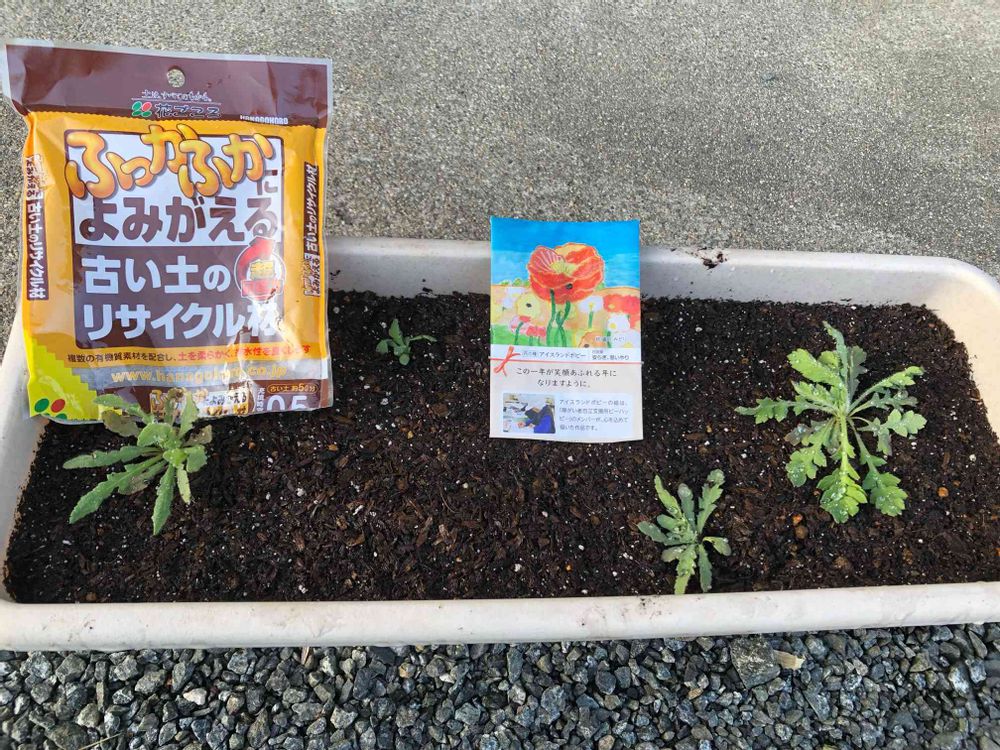 ポピー 鉢底石を置いて古い土とふかふかに再生出来る土とオルトラン、マグァンプkを混ぜて水やりをしてから