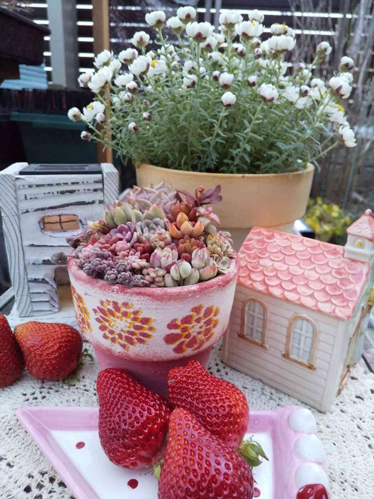 ハルさんのWSで使った鉢ですね〜寄せ直してかわいい子がいっぱい入りましたね〜(*≧∀≦*)💕いちご🍓美味しそう(*´﹃`*)私も明日買ってこようかなぁ(*´艸`)