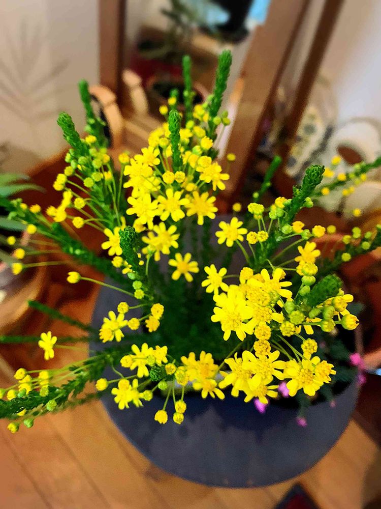 花期になると、枝先の葉の付け根から花柄を伸ばし、花径0.5~1㎝程度の黄色い頭状花を咲かせます。