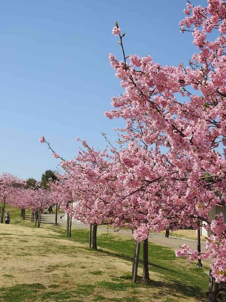 青空とコラボ❗濃いピンクの花が素敵な満開の🌸河津桜🌸