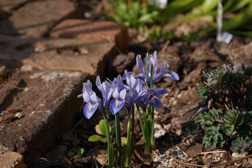 ミニアイリス 去年の一月買って急いで植えた芽出し球根。ここかしこで増えて咲きました。今年の開花はミニミニながらどっしりしてます