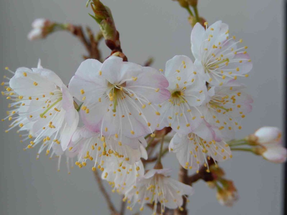 咲きました.カラミザクラ.唐の実のつくサクラ.花弁の先端がピンク色をしている.