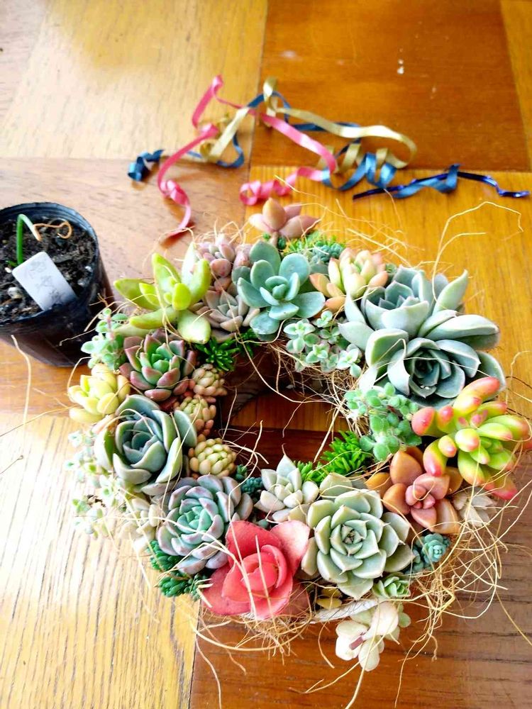 個人の主観、好みで位置を決めて良いと思いますが、これは、リボン🎀の位置を決めて、対して、トップに同じ苗を使ったので、上下にした方が収まりが良いかなと。(*^^*)