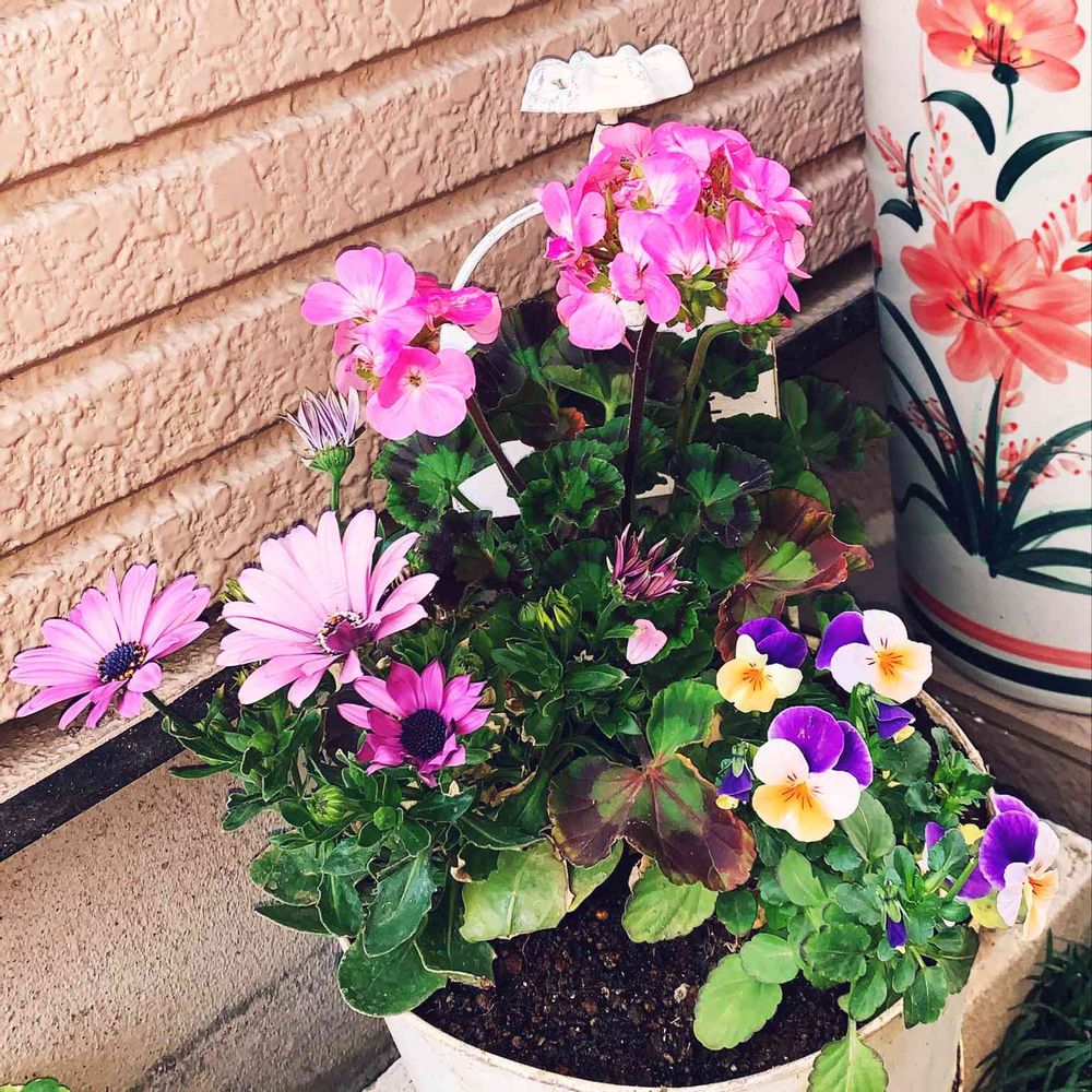 蛇口モチーフ付きのブリキプランターに、ゼラニウム・オステオスペルマム・ビオラを寄せ植え➖🎶💖😍