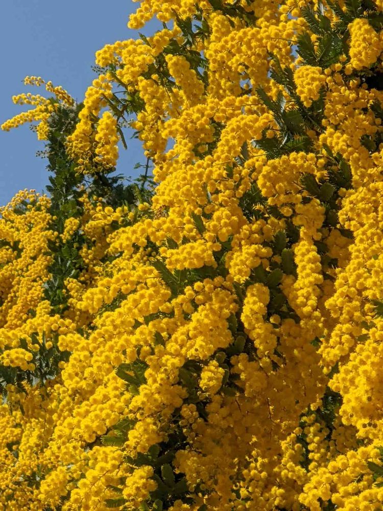 民家の庭先で青空とコラボしてモリモリと咲き誇る🌼ミモザ🌼