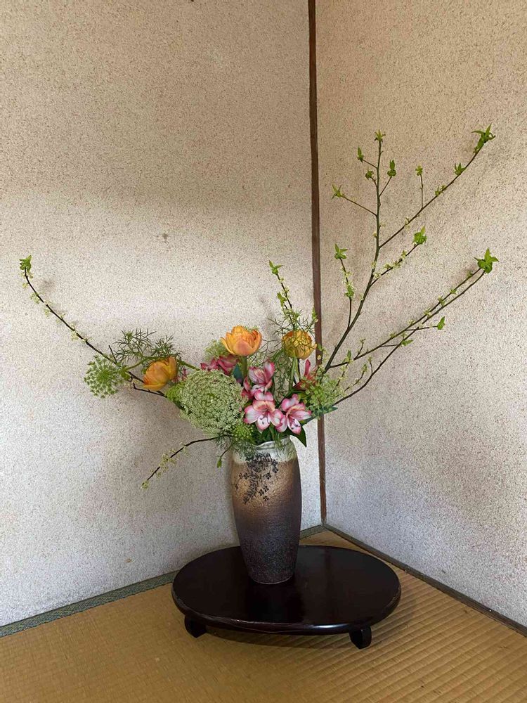 お花は言うことを聞いてくれませんので、毎回教本を傍に置いて生けております🌸😅💐