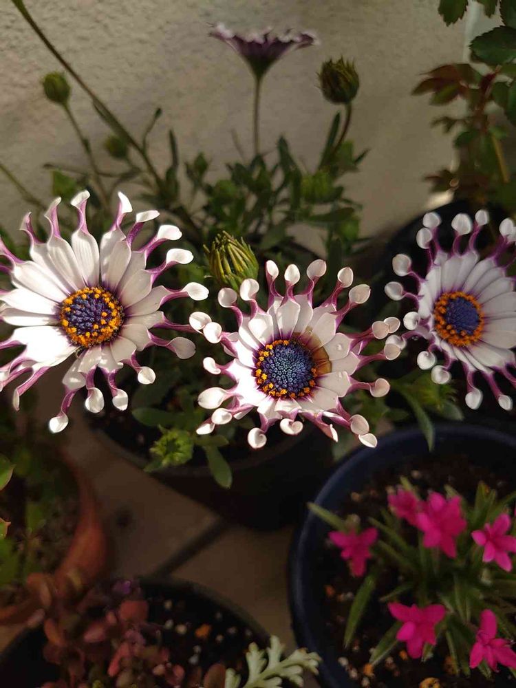 スプーン咲きのオステオさんがたくさん咲いてきましたヾ(*´∀`*)ノ3つ並んで咲いていたのでパチリ📸今日も良いお天気です🌱お花のお世話したいけど、出勤します(^_^;)🎶