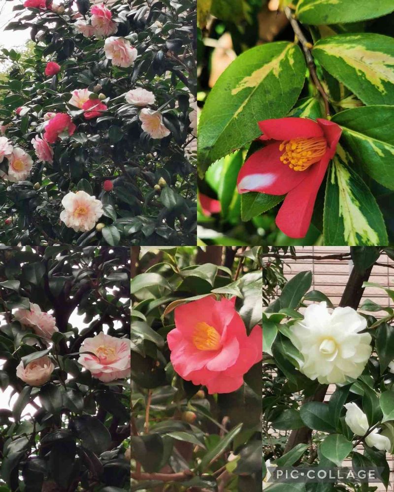 右上は、中斑(葉の真ん中が白い)の珍しい椿です。🌿