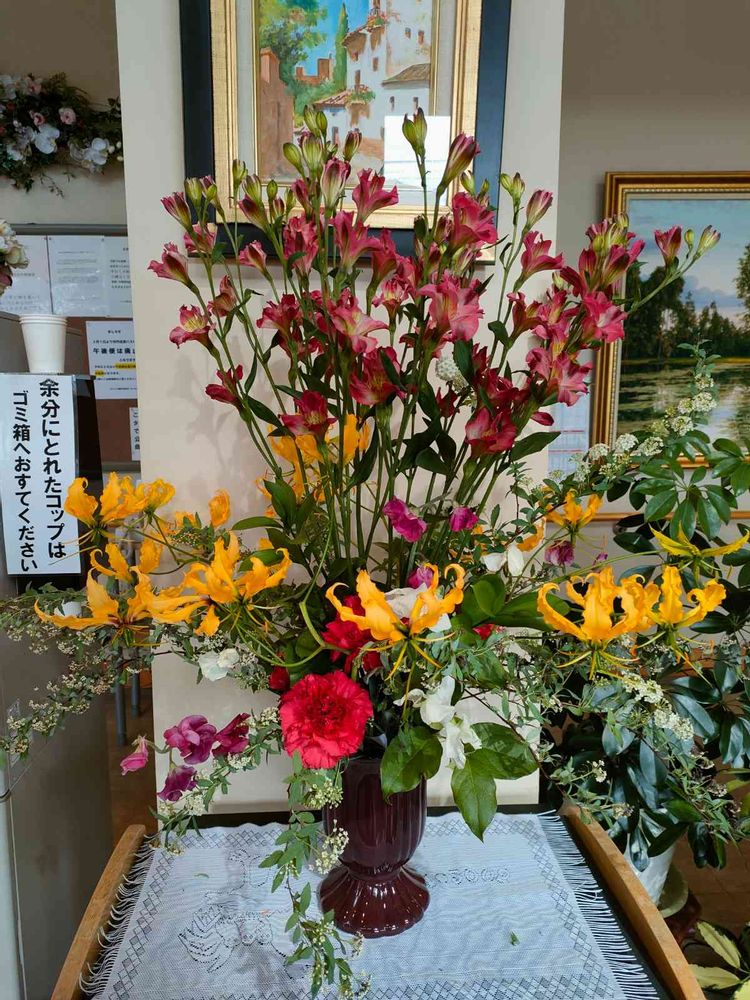 中々背丈が長いね〜斬新な生け花だよね〜!どなたがされてるんだろうわ😆黄色のグロリオサ素敵です♪とても明るい気持ちになりますね〜❣️