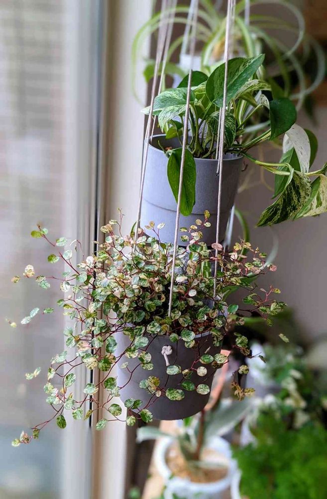 ビニールポットくらいのサイズではあるけどハンギングしたらこんもり感アップしました😊窓辺にハンギングしてたらけっこうすぐ土乾きます💦強い日差しとかには弱そーだから真夏はもうちょい日陰に移動かな〜💦チリチリーズな予感(笑)