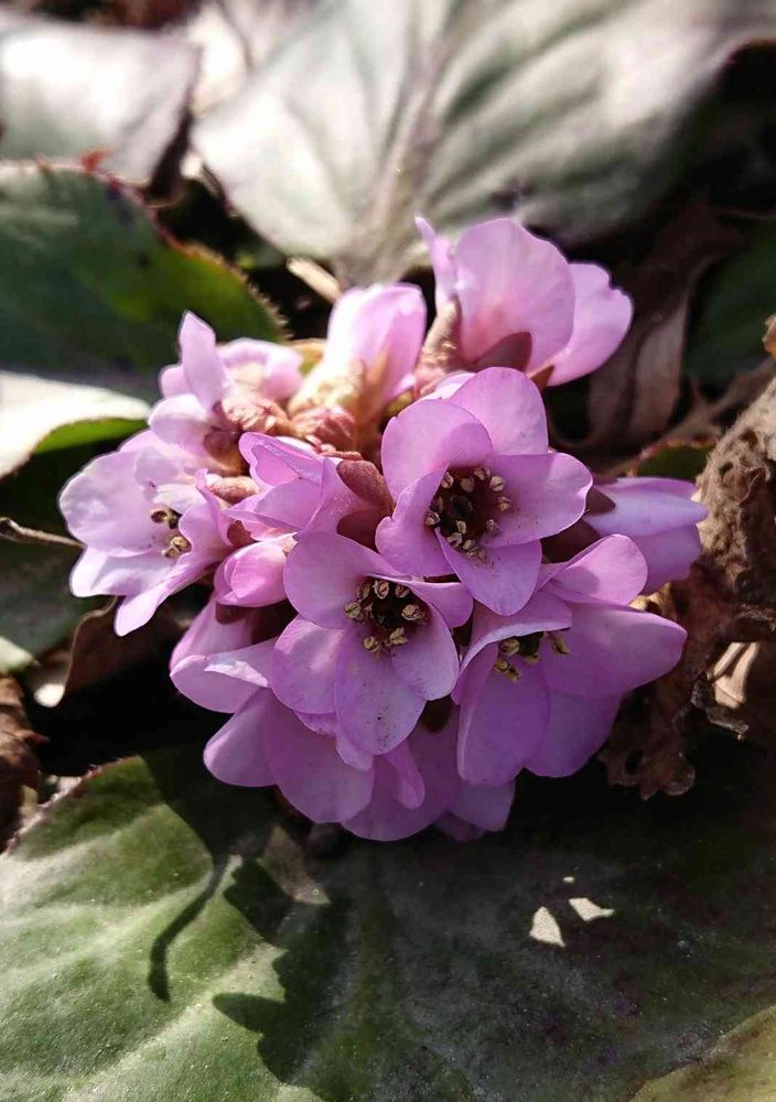 ユキノシタ科ベルゲニア属の多年草。東アジア〜中央アジア原産。明治時代初期に鑑賞用として渡来し、庭や花壇、鉢植えなどで栽培される園芸植物。高山植物なので乾燥や寒さに強いが、暑さや多湿に弱い。丈夫で育てやすいので、株分けにされてあちこちで見られる。常緑の葉はしゃもじのような形で厚く艶がある。花期は2~5月。高さ20〜30㎝の花茎に淡紅色あるいは白色の花が多数集まってつく。別種どうしの交雑種も多く作られているが、どれも区別せずヒマラヤユキノシタの名で流通している。
