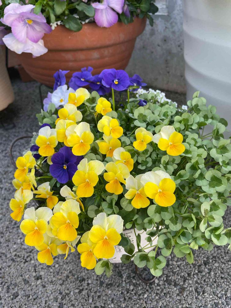 黄色のビオラの間からパープルのビオラが顔を出してる😙一緒に寄せ植えしたプリンセスクローバーの勢いが止まらない💦