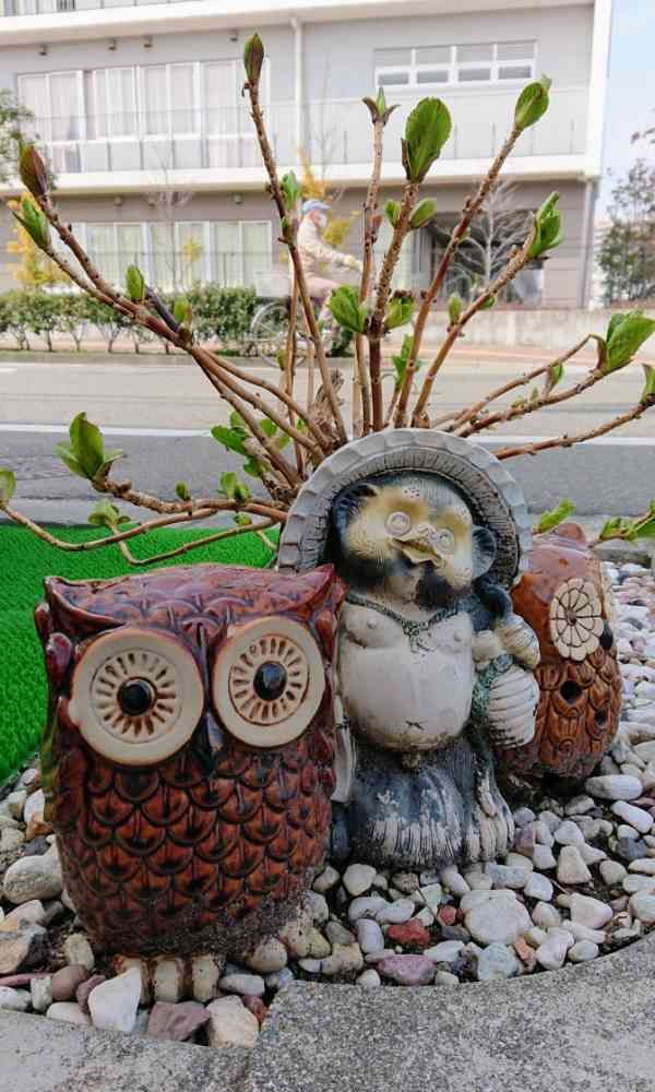小学校の向かい側で、可愛いフクロウ🦉とぽんぽこタヌキに守られた紫陽花の新芽🌿