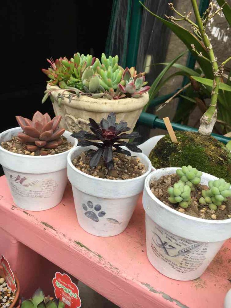 午前中は部屋にこもってリメ鉢作ってました。久しぶりに無心になってしまい、気がつけば子供の帰宅💦昨日買っておいた多肉さんたちを植え込んで自己満足の世界へ〜(手前3つです)