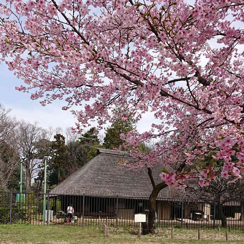 江戸たてもの園の建物をバックに大漁桜と言われているようです。早咲きの桜です今が満開春爛漫🎶