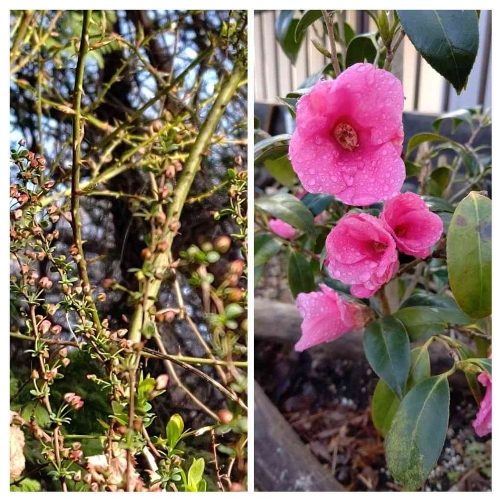 今年、初めて花を着けてくれた椿。蕾の時が一番ピンクで可愛い❗️ピンク雪柳。