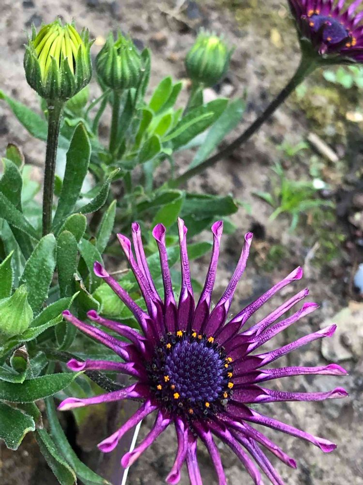 瀕死状態で届き、新しい苗を送ってもらったオステオスペルマム スパイダーの新色パープルちゃん。やっと咲き出しました。