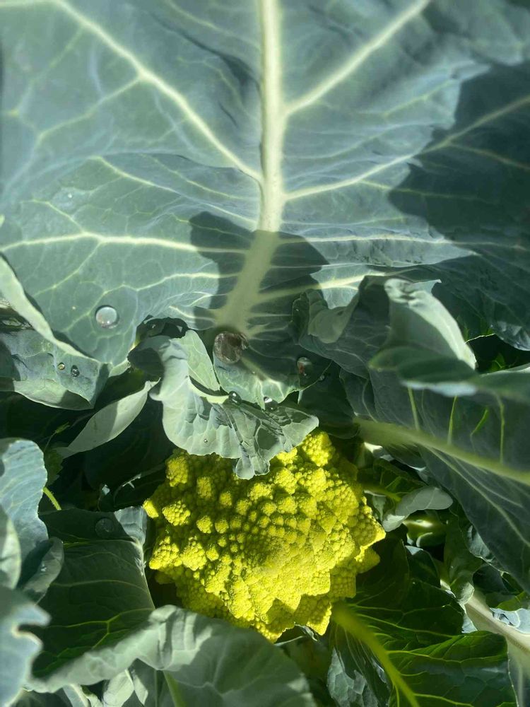 おしゃれな野菜で有名なロマネスコの葉っぱが青かったことを発見しました。