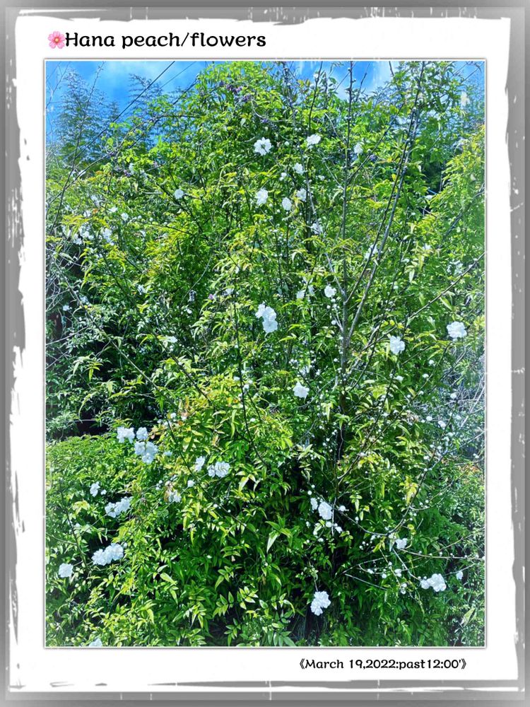 ♡この写真画像は、わが万葉の中庭に咲きはじめている白い花桃デスが、すっかり羽衣ジャスミンの枝蔓に囲まれています🐶