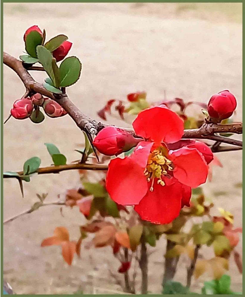 ボケ、鋭いトゲに真っ赤な花 😃