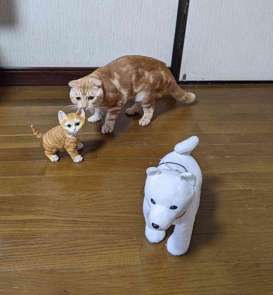 息子宅の😺ロキ君です…疲れも見せずに弟分置き物ラキちゃんとソフトバンクの白ちゃんと賑わっているよ💖