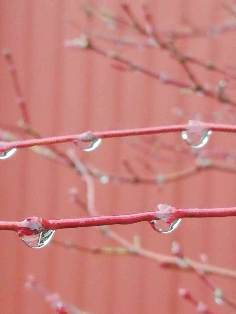 昨日素敵な雫💧の投稿を見て…今まで苦手だったけど撮りたい気持ちになった。昨日の夕方、雨☔は止んでたけど赤いトタン壁に赤い枝も面白いかも🙄