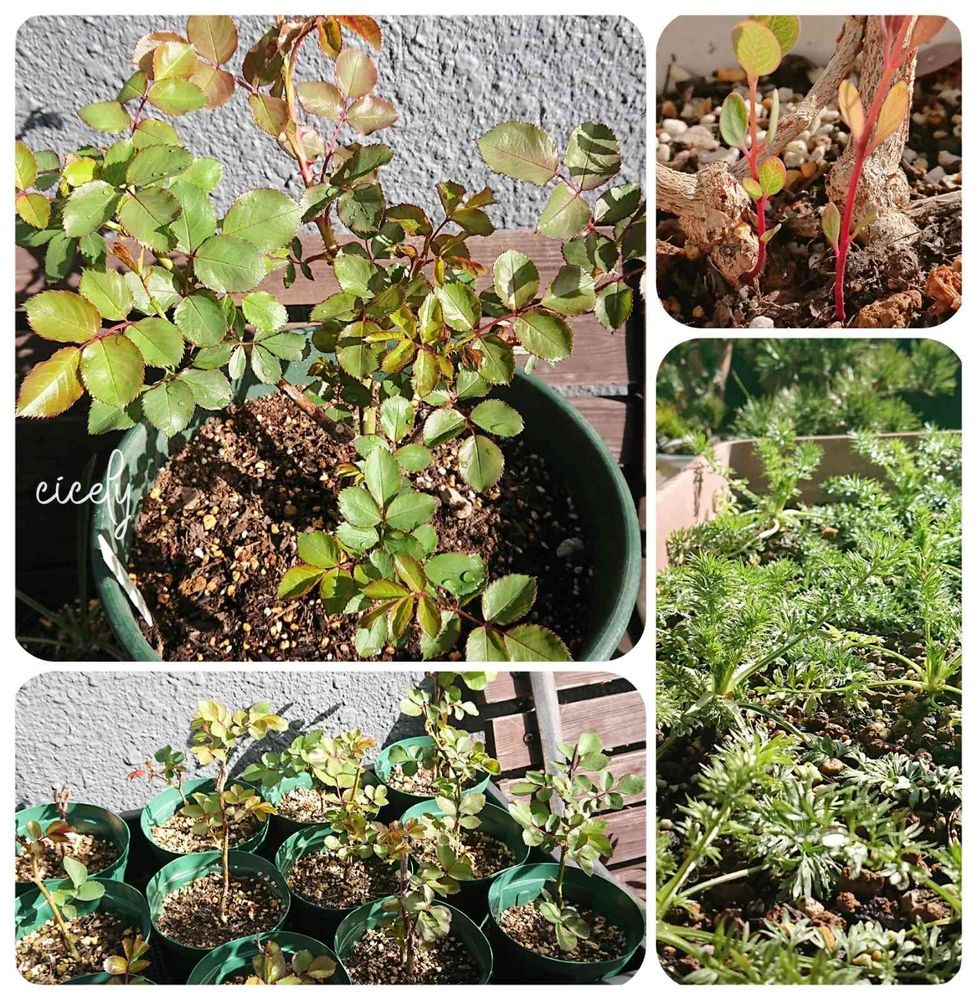 左上、冬剪定して鉢も2回りくらい大きいのに植え替えたバラで、葉がワサワサ出てきています。下の挿し木はこのバラの子供達で、一年くらい前に挿し木したもの。あんまり育ってない気がする…でも葉が展開してきて嬉しいです。