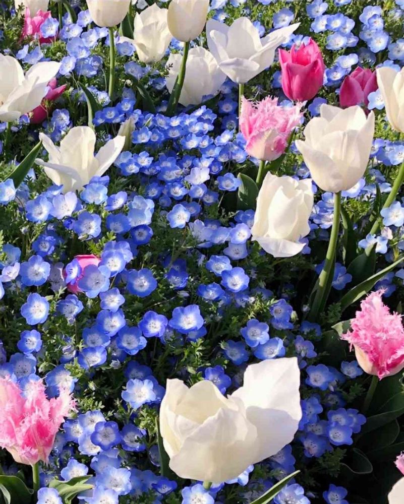 ネモフィラの間からチューリップが顔を出して可愛いですね💙🤍💗