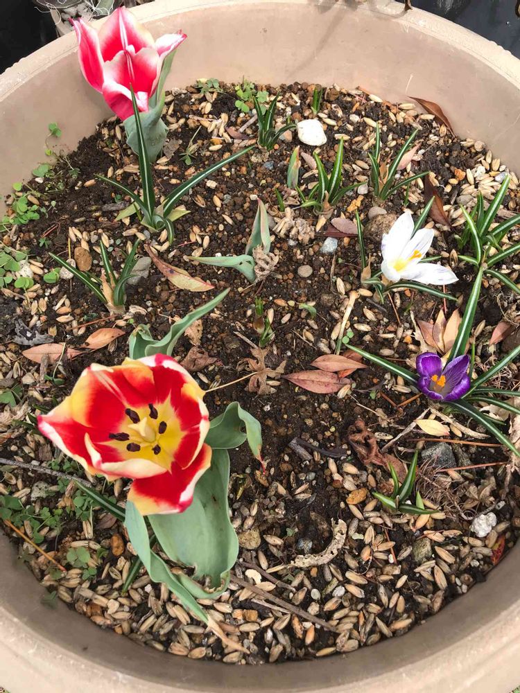 チューリップ 咲きだしました。クロッカスは葉も綺麗。