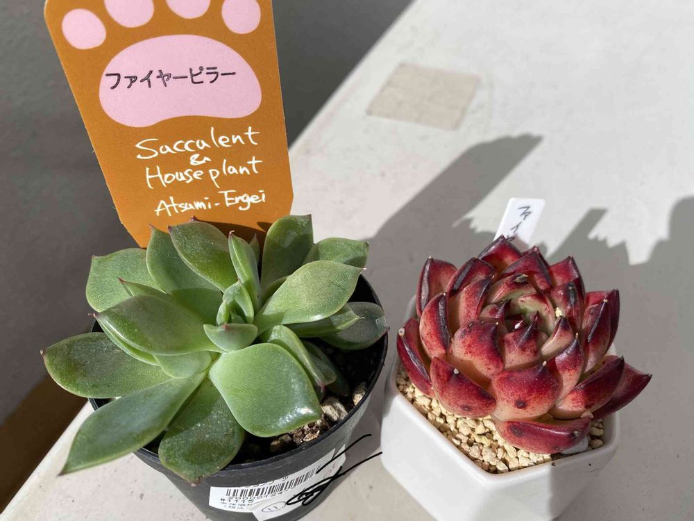 昨日ホムセン多肉の見切り棚からお迎えしたファイヤーピラー。右は我が家の先住の子です。この子は夏もあまり形を崩す事がないのに同じ植物とは思えない徒長つぷり!