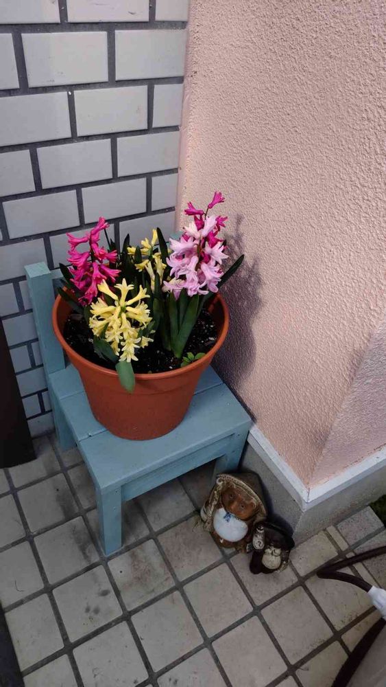 今年も咲き始めました、ヒヤシンス。自作の椅子に乗せてます
