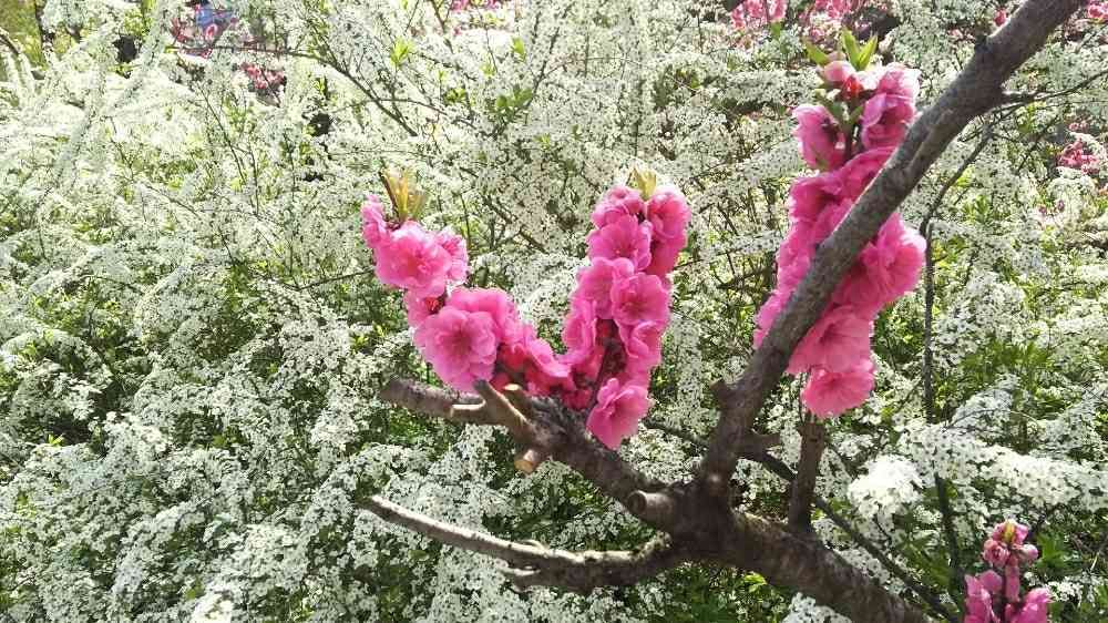ユキヤナギの中に、ピンクのハナモモが映えますね👍💕