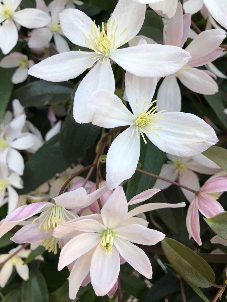 教えて頂き、クレマチスアーマンディと言うことが分かりました。園芸品種として、「チェリーブロッサム」「アップルブロッサム」「日光」と言うのもある様ですが、見分けがつきません💦