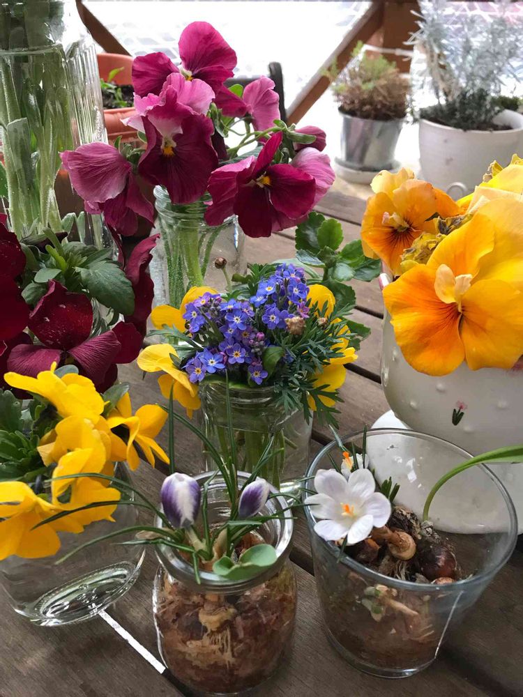 伸び切ったパンビオやワスレナグサをポキポキと折って水に挿しました😃🌸ポイポイ極小球根もちっちゃくさいています!クロッカスは花びらのの裏もキレイ!🎶