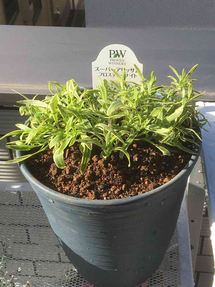2月に半日陰に地植えしたPWのスーパーアリッサムフロスティナイト。なかなか花をつけないので、鉢植えにし、南側の日当たりの良い場所へ移動しました。元の場所は、夏場の直射日光を避けられて良いと思ったのですが、日光の量が足りなかったみたいです。今後、どのような変化があるか楽しみです。