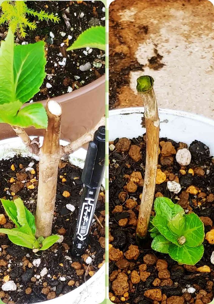 左は先端を挿し木して余った下半分を挿し木した「品種不明のガクアジサイ」