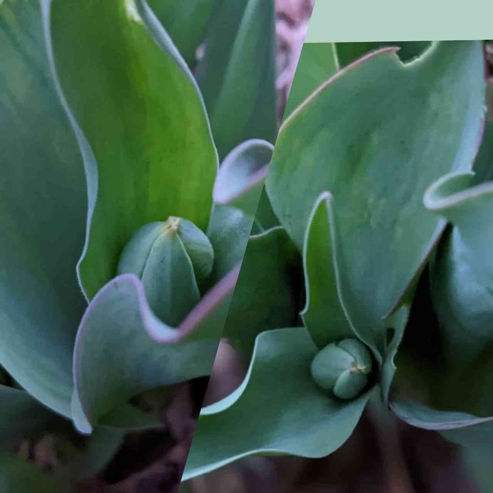 チューリップの蕾が未だ葉っぱの中に潜んだまま膨らんでいます…お花の赤い色は未だ見えていません