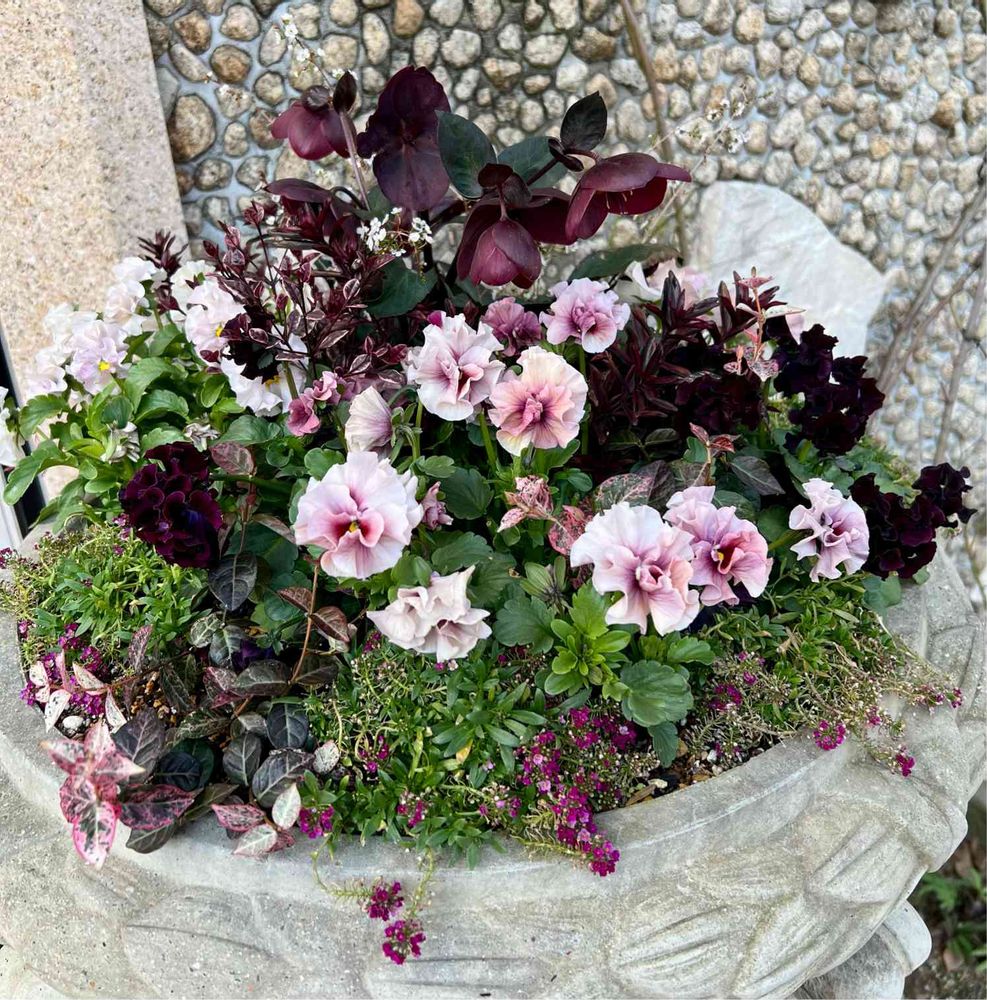 大人色のクリスマスローズに乙女色ピンクのビオラ、アリッサム、ハツユキカズラなどの寄植えがとっても素敵でした💞