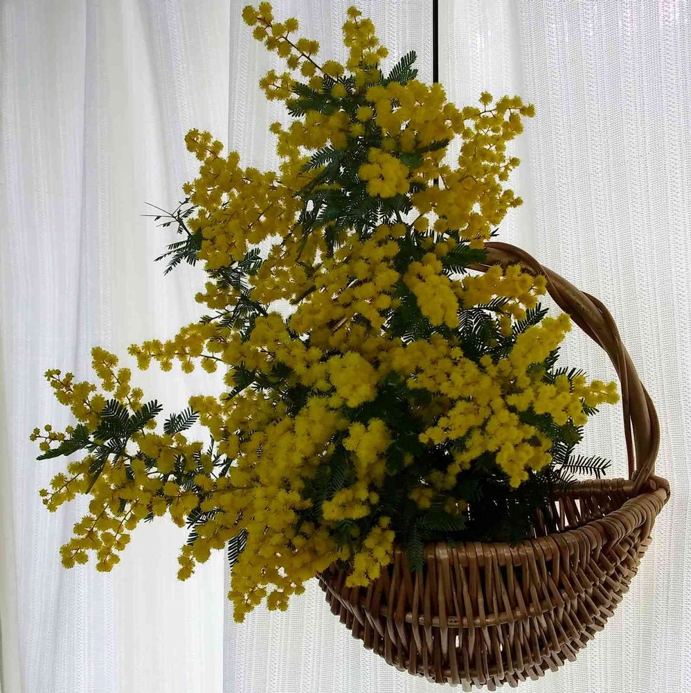 ミモザを籠にいれてカーテンレールに掛けました🤗💕