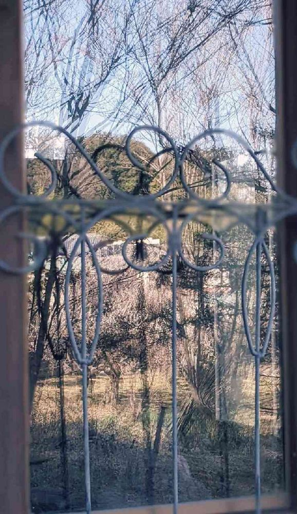 庭の小屋の窓に写った風景も何だか春めいて来ています…