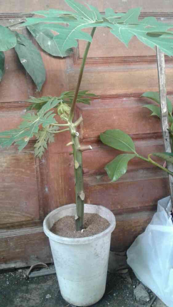 裏庭のパパイヤ雌株が分枝していたので、備蓄の砂を殺菌消毒して枝を挿木しました。雄株や中性株が多いので何とか収量を増やそうと言う作戦です。