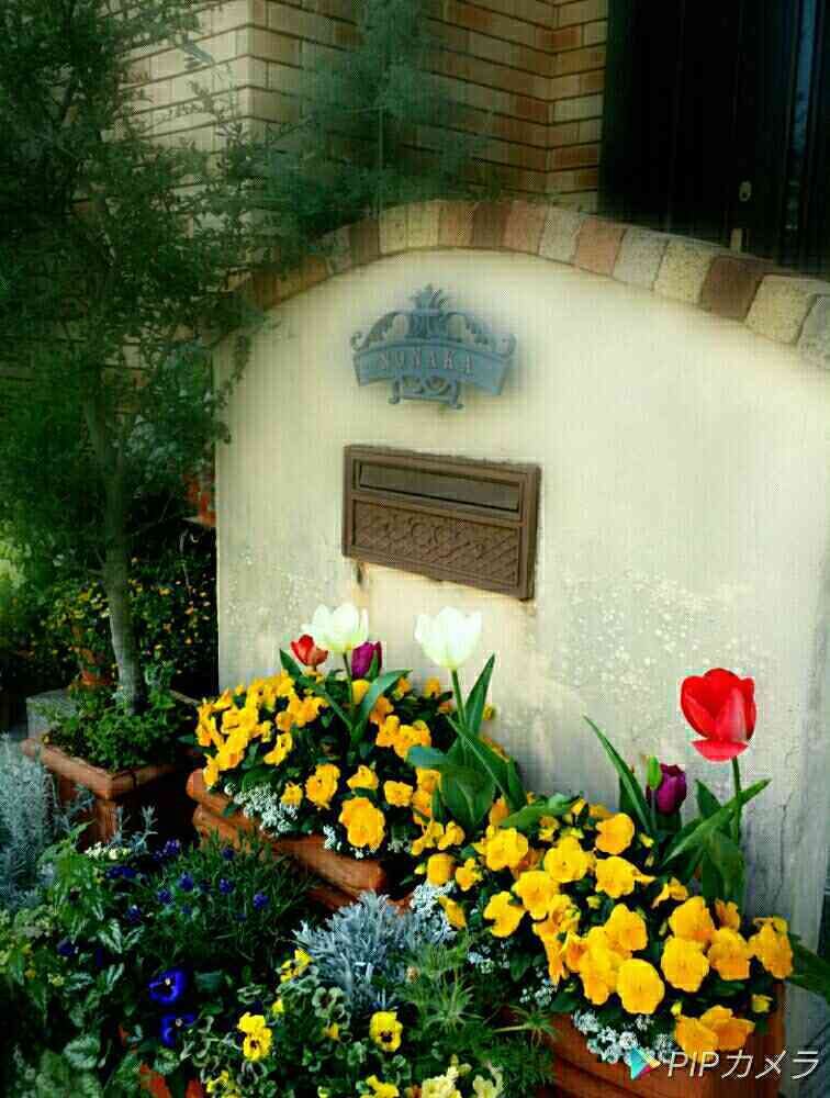 🌷🌷ビオラの間から可愛いですねえ🌷🌷玄関前が明るく素敵なので