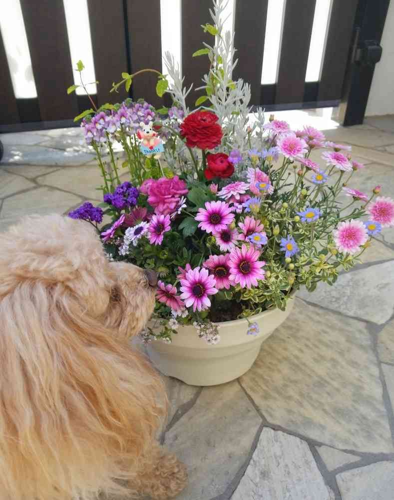 かわいい😍🐶ピンクの寄せ植えもかわいいですね。😊
