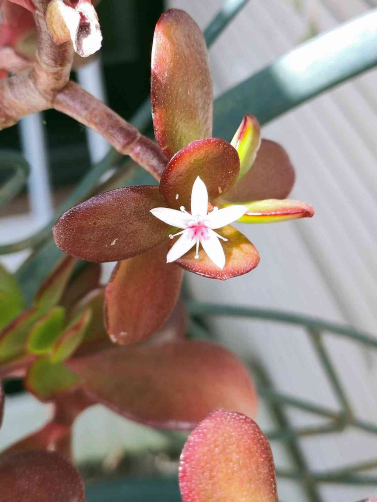 鉢植えの「金のなる木」に小さなお花が咲いているのを見つけました💮