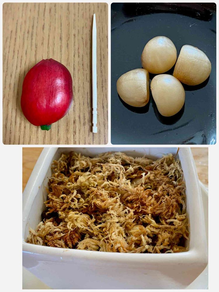 思いのほか大きな赤い実の中からマカダミアナッツみたいなタネが4個採れました
