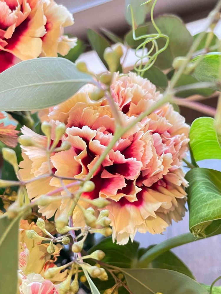 久しぶりにいいお花を買った🤗この前ハピバで頂いたアレンジの葉物がまだキレイだからお花を足したいと思った。今日は虹の橋を渡った愛猫🐈⬛と私が公園で出会った記念日なのでケチらず奮発。素敵なカーネーションを見つけました。