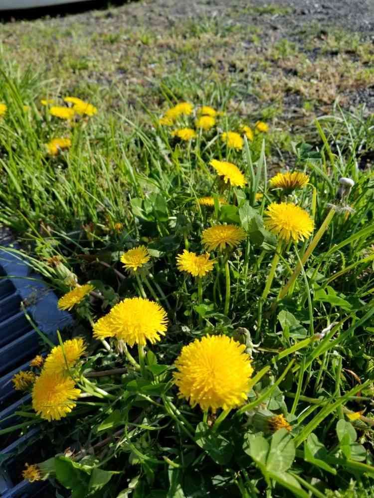 駐車場の端、日当たり抜群❗誰にも踏まれず、元気なタンポポの群れ☀