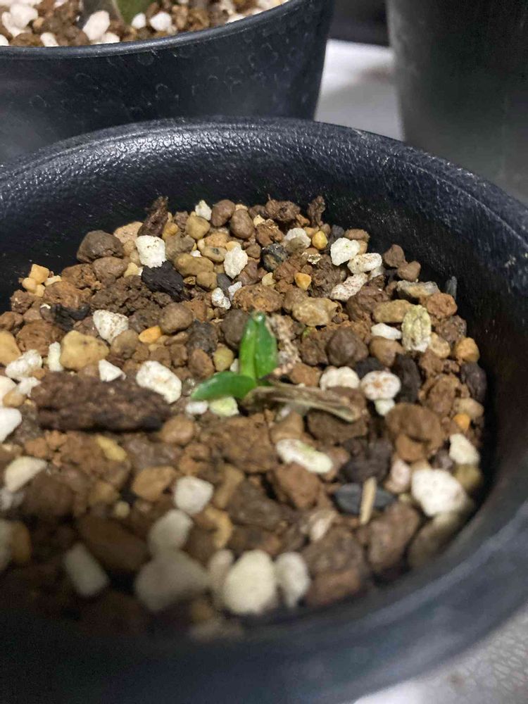 鉢落下事故で瀕死の重傷を負ったオテロイの赤ちゃん👶葉っぱの全長全盛期の半分の3ミリかな!