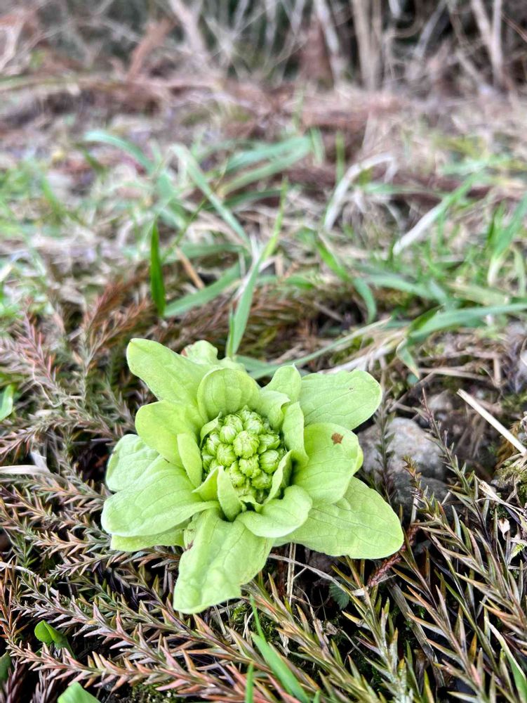 重なった杉の葉の隙間からふきのとう🍀が顔を出して、お帰り💕の声が聞こえます
